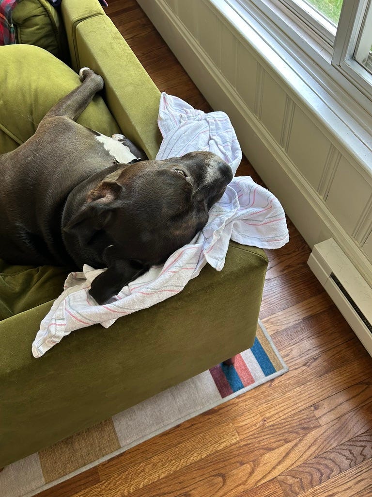 Man, I love this dog. A few months ago, I told some friends that one of my fears of parenthood was that I would love our kid less than our dog. That fear hasn’t been realized, but I have found clarity that dog love and child love are just different. They both need us, but Goose has such a purity of spirit and selfless nature that it’s impossible not to feel overwhelming gratitude and affection for this animal who sleeps in our bed.
